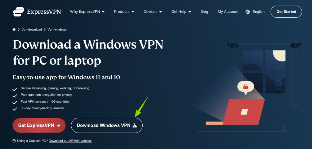 - 通过本页面提供的优惠链接进入ExpressVPN官网。