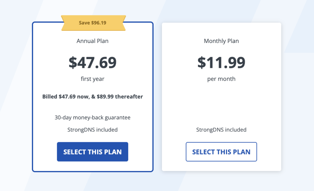 在价格方面,StrongVPN的性价比较高,年付套餐折合每月仅需3.97美元,年总计47.69美元,对于预算有限的用户来说是一个不错的选择。此外,StrongVPN经常推出促销活动,如果在活动期间购买,价格会更加优惠。另外,StrongVPN还提供30天退款保证,有任何不满意的都可以随时申请全额退款。