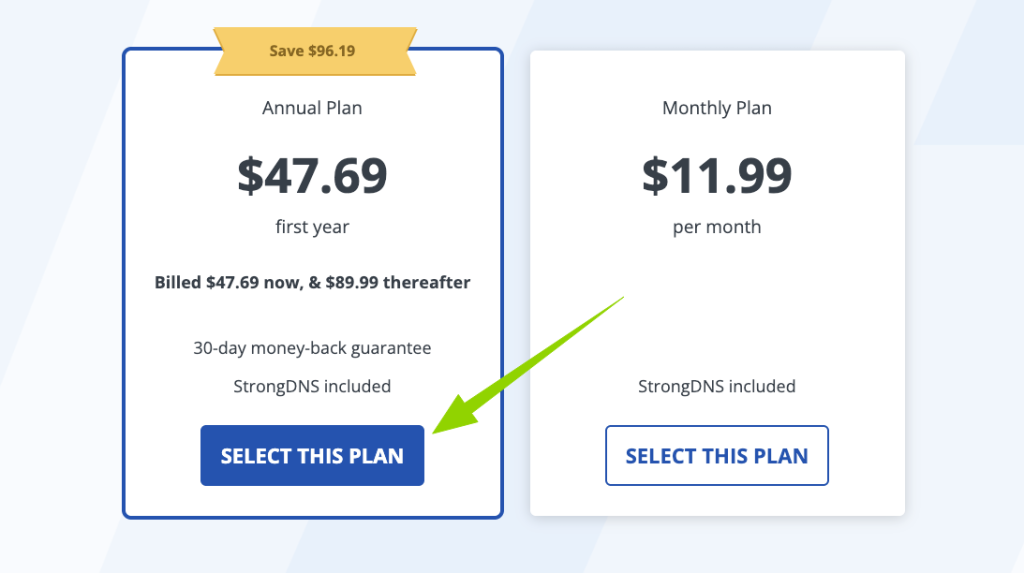 ⑵第二步:选择“Annual Plan”套餐,并点击“SELECT THIS PLAN”按钮。