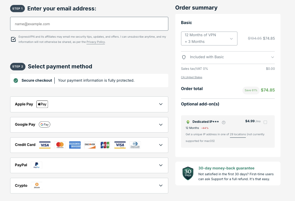 ExpressVPN提供三种订阅时长:1个月、1年和2年。通常来说,2年套餐的性价比最高,不仅单月费用更低,还额外赠送4个月的免费使用期,折算下来每月价格更加实惠。你可以根据自身需求选择适合的套餐,但如果计划长期使用,2年套餐无疑是最佳选择。同时,所有套餐均享有ExpressVPN提供的30天无理由退款保证,让你可以无风险地体验其服务。